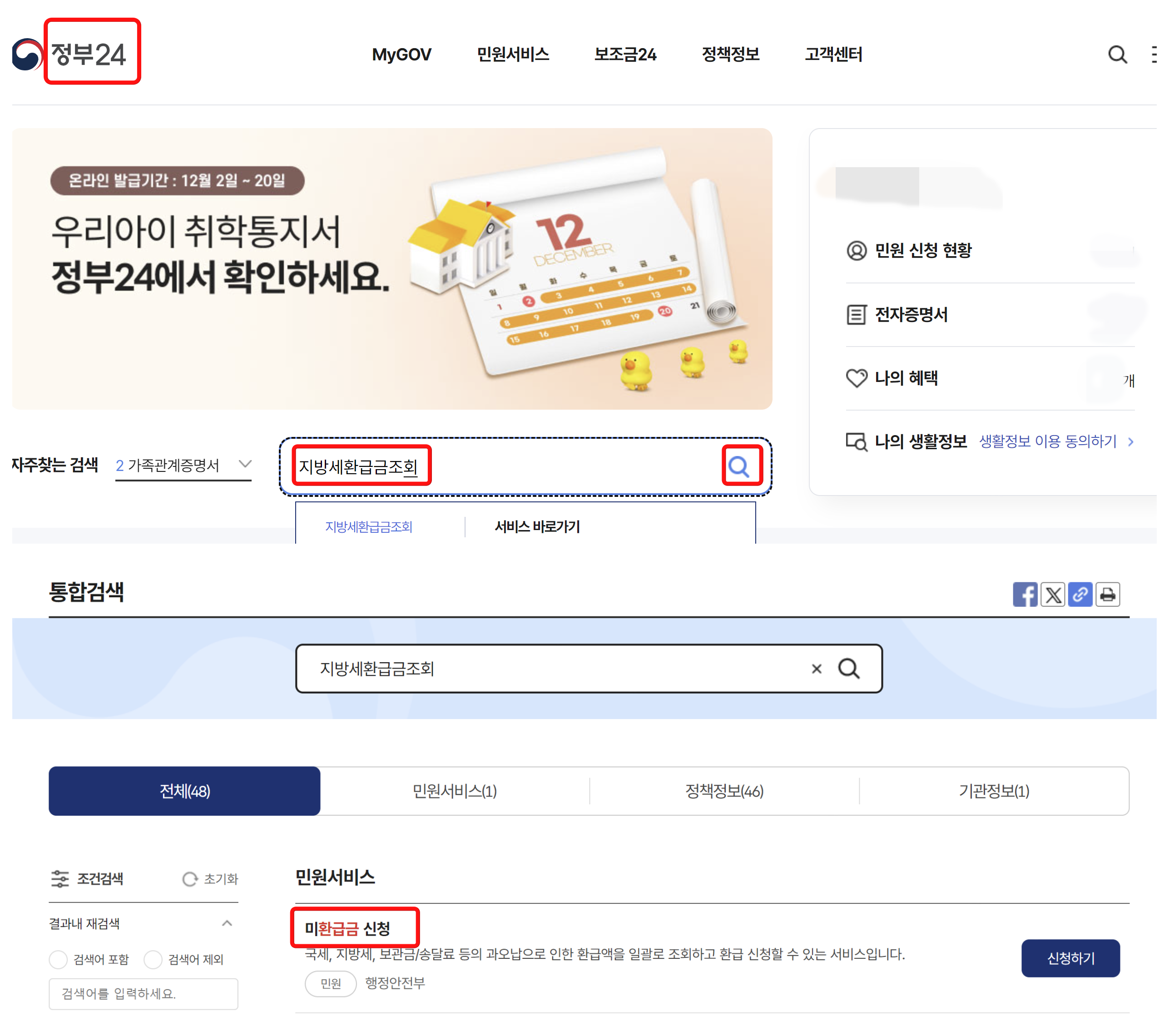 정부 24 홈페이지를 통해 지방세 환급금 조회뿐 아니라 국세, 건강보험료환급금, 보관료, 유료방송환급금 등 환급금을 조회할 수 있어 여러 가지 환급금을 동시에 확인하고 싶다면 정부 24를 이용하시는 게 편리해요.